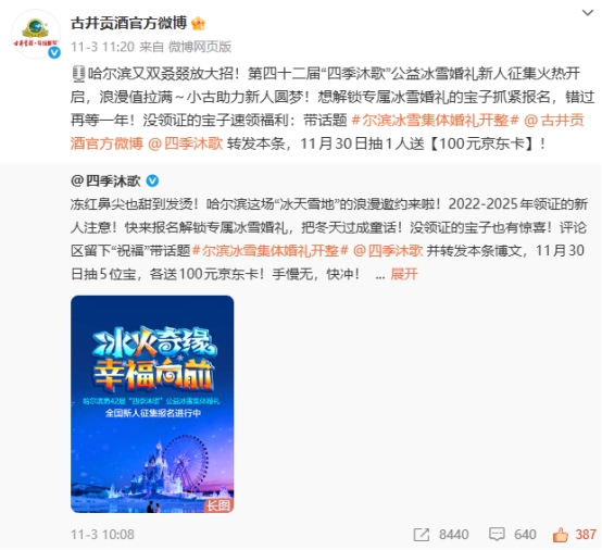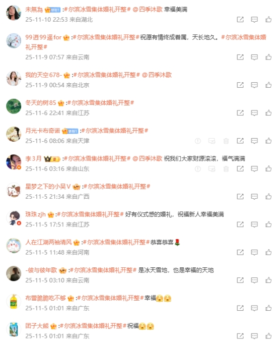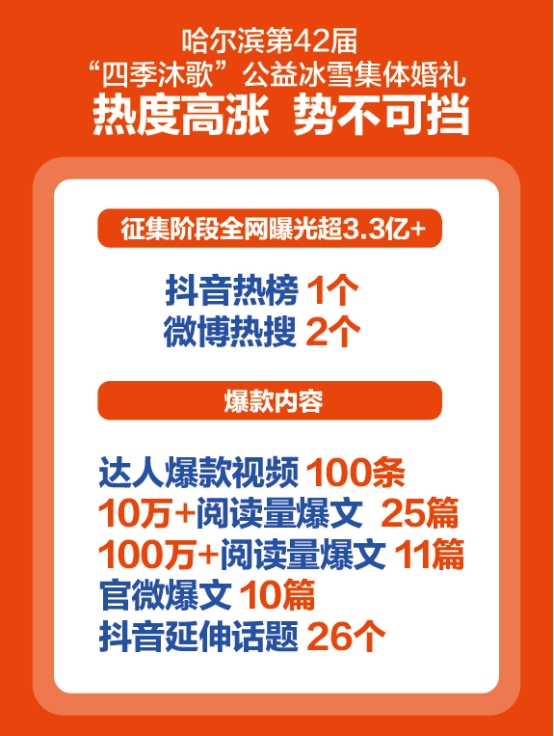 网络端的热度同样呈现“井喷式”增长。45天征集期内,#尔滨冰雪集体婚礼开整#、#尔滨今冬首波宠粉冰雪集体婚礼全免费#、#哈尔滨冰雪集体婚礼#、#冰雪婚礼#、#尔滨冰雪婚礼报名创新纪录超1.4万对#等核心话题持续发酵:2次跻身微博热搜榜,微博曝光量突破5000万+;登上抖音热搜榜1次,相关话题短视频播放量超2亿次。其中,全国旅游类达人、哈尔滨本地网红、游客等自发创作四季沐歌公益冰雪集体婚礼相关短视频播放量超1亿+,真实内容引发网友共鸣,全网曝光量超3.3亿+,活动热度还在持续攀升。