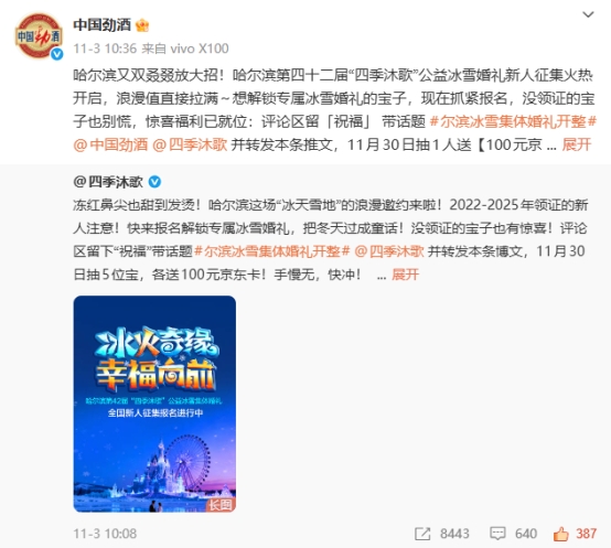 不仅如此,这场婚礼还激活了社会凝聚力。来自全国各地的新人将因冰雪婚礼汇聚哈尔滨,他们在抖音、微博等平台分享自己的婚礼期待与筹备日常,形成了“爱情+冰雪”的热门话题矩阵。网友们纷纷留言“想在冰雕前许终身”,这背后是冰雪符号与人们情感需求的深度契合。原本属于私人的婚礼仪式,在此刻升华为公共文化事件,不仅强化了人们对哈尔滨这座城市的认同感,更在社会中注入了温暖的情感纽带。